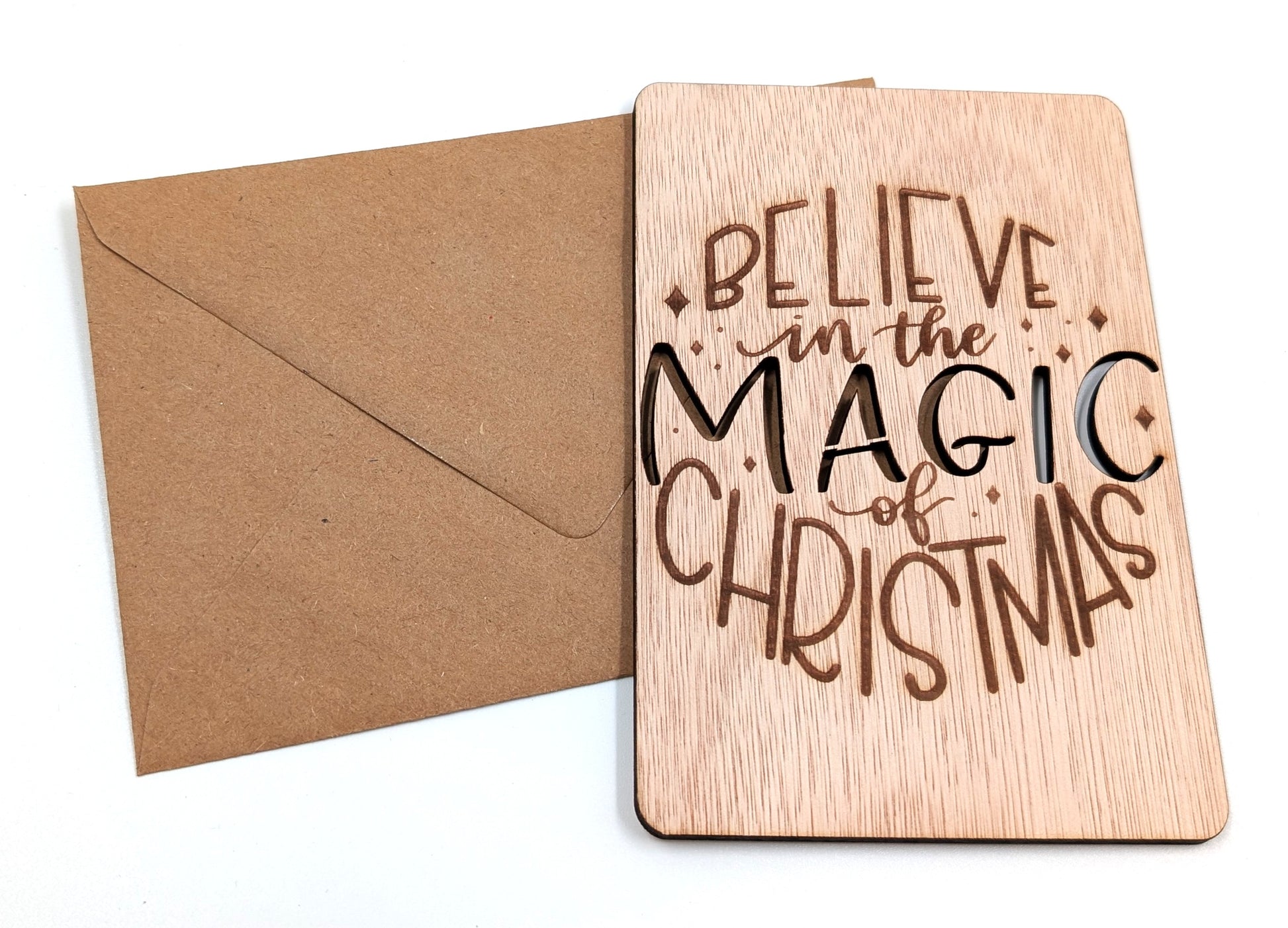 Houten kerstkaart – Believe in the Magic of Christmas – tekst uitsnede – kerstkaart met envelop – luxe kerstkaarten
