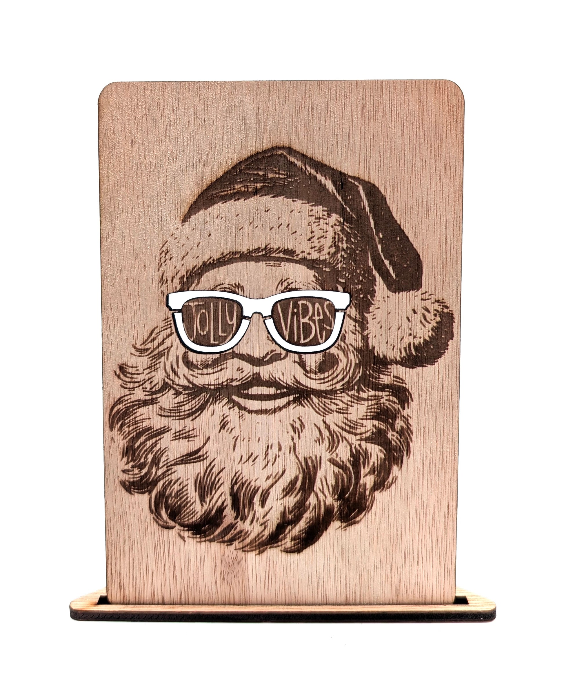 Houten kerstkaart – Jolly Vibes kerstman – kerstkaart met zonnebril – kerstkaarten met envelop – luxe kerstkaarten